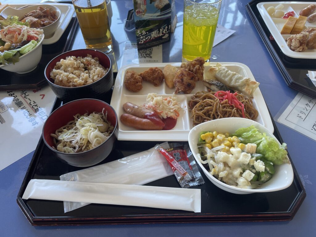 きのこの炊き込みご飯、冷そば、サラダ、大葉とささみチーズ巻きフライ、イタリア風フライ、棒餃子、唐揚げ、カニカマサラダ、鯖の塩焼き、ソーセージ(2種)、焼きそば