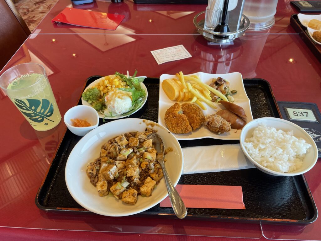 ヤッシーが選んだのは、左上から、サラダ、卵焼き、ポテト、イカの軟骨チーズ焼き、さつまいものコロッケ、唐揚げ、ソーセージ、麻婆豆腐、ライス、レモネードです。