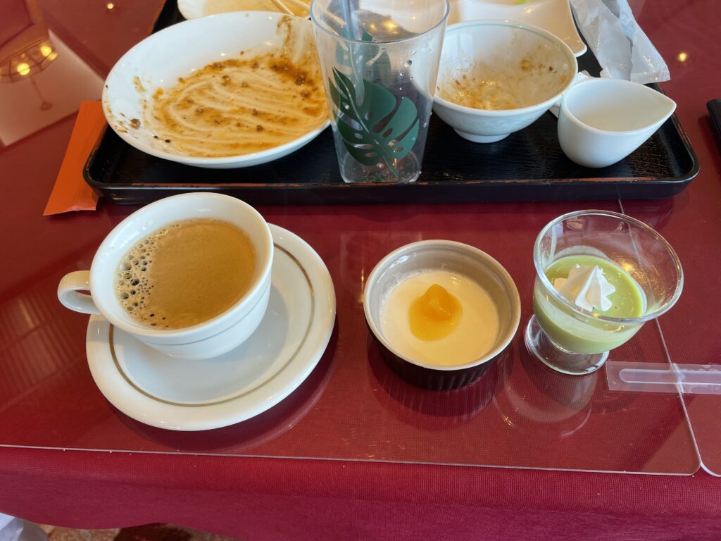 デザートはホットコーヒーと杏仁豆腐、抹茶ババロアです。